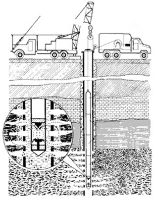 У свердловині, заповненою рідиною, високовольтним імпульсним розрядом збуджують циклічні хвилі стиску й гідропотоки, які руйнують відкладення в зоні перфораційних отворів, розвивають старі й утворюють нові тріщини в породі, що приводить до переміщення рідини в зону активного дренування. Реалізується мобільним свердловинним пристроєм.